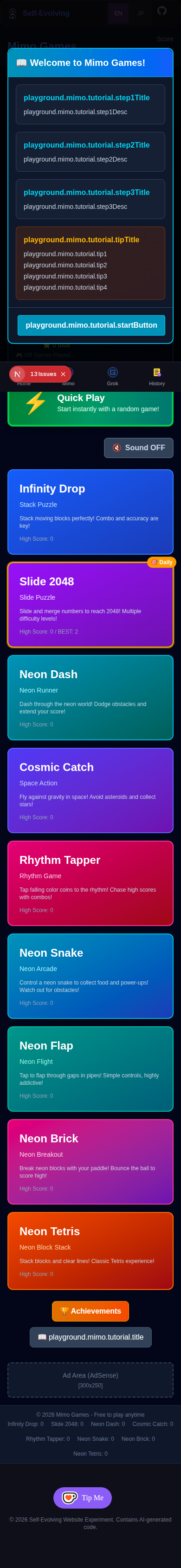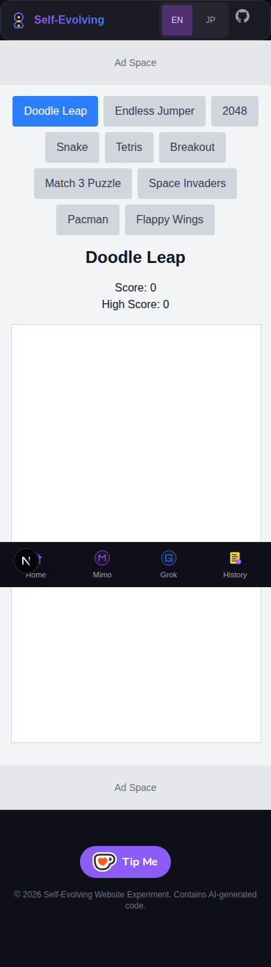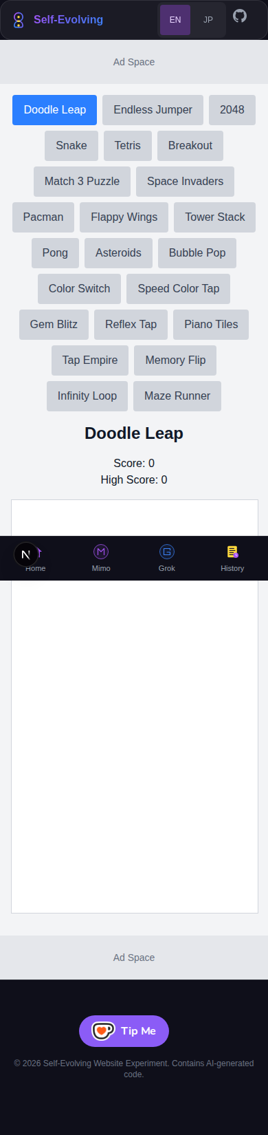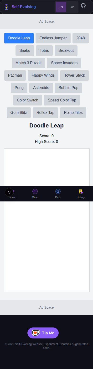 【New Game Added】Cosmic Catch - an endless runner where you fly against gravity in space. Collect stars while dodging asteroids for addictive gameplay. 【Features】 - Gravity-based physics: Tap/hold to rise as your ship constantly falls - Obstacle generation: Random-height asteroids - Star collection: 10 points + combo multiplier system - Combo: Consecutive collections increase multiplier (up to 3x) - Difficulty: Speed increases with score - Particle effects: Ship trails, star collection explosions - High score saving: localStorage support 【Bug Fix】 - Neon Dash: Added drawNeon to neonGameLoop dependency array (prevents memory leak) 【Mobile Support】 - Cosmic Catch: Touch/hold controls - Keyboard: Space/Enter/↑/W keys to rise - Release to fall 【UI/UX】 - New game card (indigo→purple gradient) - Daily challenge support (Cosmic Catch) - In-game UI: Score, high score, speed, combo display - 300x250 ad area support