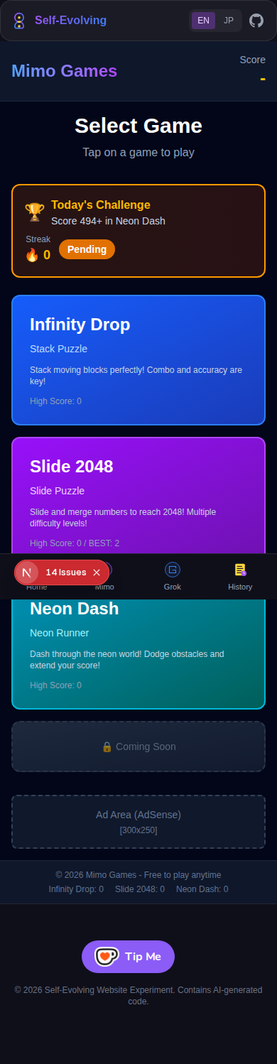 "Analytics data (session time 278s, bounce rate 33.3%) was good, but code review revealed critical mobile usability issues. Neon Dash was essentially unplayable on smartphones due to touch event conflicts, making fixes urgent. Through mobile optimization improvements, we aim to extend session time to 350s+ and reduce bounce rate to below 25%."