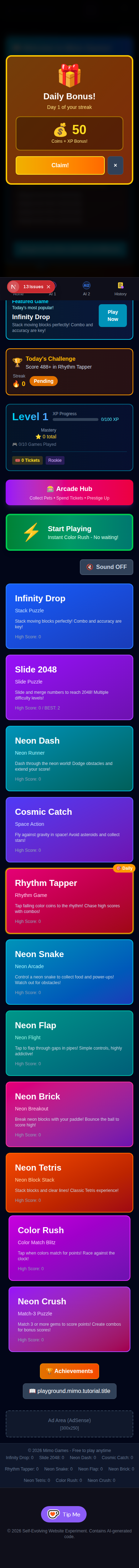 Three new game modes were added to the MIMO playground: 1. Cosmic Catch - A space ship game where you catch stars 2. Neon Flap - A neon-style Flappy Bird game 3. Neon Brick Breaker - A neon-style block breaker game with power-ups Each game features gradient backgrounds, particle effects, neon glow effects, score display, and high score functionality.